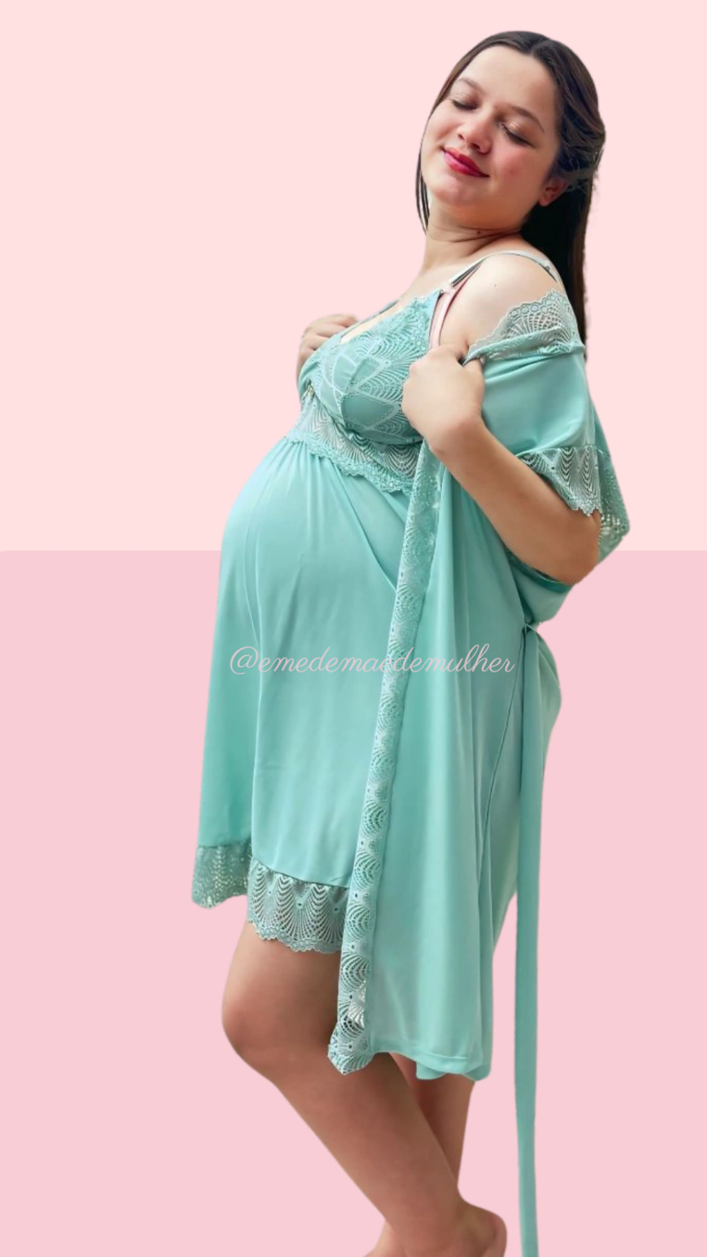 O kit é comporto por 1 Camisola de amamentação, que possui tecido em malha fria (poliéster), busto é todo coberto com renda + 1 Robe que pode ser usado como sobreposição da Camisola, e é um item da solicitado na Mala Maternidade!