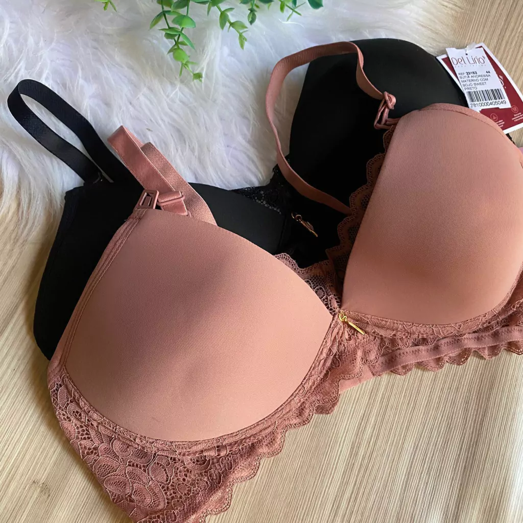 Com bojo coberto em renda e com botão de pressão, alça com o click, para facilitar na abertura ao amamentar, conforto para a mamãe e bebê;